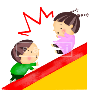 滑り台でぶつかりそうになっている子どものイラストです。子育て関連や保育園、幼稚園、学校などの資料作りなどにお使いください。(こども子ども子育て家族)