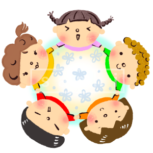 友達同士で仲良く輪になっている子どもたちのイラストです。子育て関連や保育園、幼稚園、学校などの資料作りなどにお使いください。(こども子ども子育て家族)