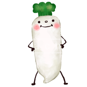 かわいいだいこんのイラストです。食べ物関係、お店、保育園や幼稚園など資料やお便りにお使いください。(野菜やさいベジタブル)