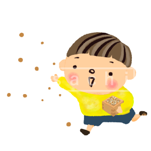 まめまきをする子どものイラストです。節分の時期などお店、保育園や幼稚園のイベント資料やお便りにお使いください。(豆まき,まめまき、おに,こども)